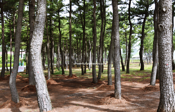 해변 뒤로는 소나무 숲이 우거져 있어 그늘에서 휴식을 취하기 좋습니다. 해변 주변에는 다양한 먹거리가 있어 식사나 간식을 즐기기에 좋습니다.