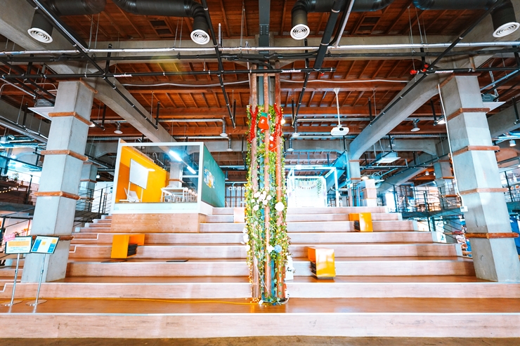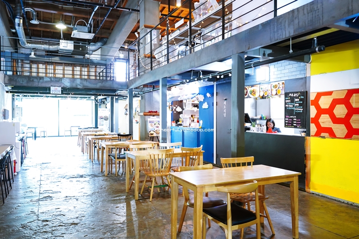 다양한 음식과 음료를 즐길 수 있는 푸드코트와 개성 있는 소규모 상점들이 함께 어우러져 있어 볼거리와 먹거리가 가득합니다. 특히, 창고 중앙에는 넓은 휴게 공간이 마련되어 있어 방문객들이 편안히 머물며 여유를 즐길 수 있습니다.