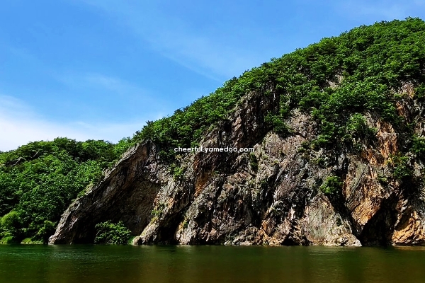 절벽 아래로 흐르는 강은 잔잔하면서도 맑아 주변의 자연을 그대로 비추고 있었습니다. 저는 강가에 앉아 바람을 맞으며 물소리와 함께 잠시 휴식을 취했습니다.