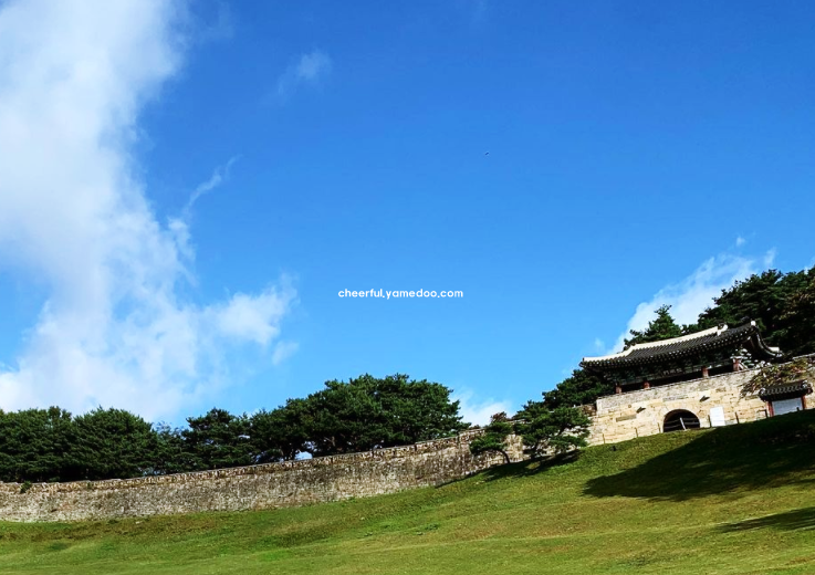 성 안으로 들어서면 넓은 초지가 펼쳐져 있어 한적한 분위기 속에서 산책하기 좋습니다. 성벽 위로 올라가면 주변 풍경이 한눈에 들어오며, 멀리 청주의 도심까지 조망할 수 있습니다.