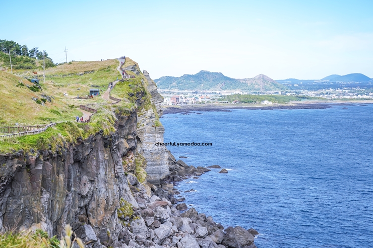 박수기정에 도착하자마자 절벽 아래로 펼쳐진 바다가 시원하게 시야를 채웠습니다. 깎아지른 듯한 현무암 절벽이 이어져 장관을 이루고 있었고, 가까이 다가가 보니 그 거대한 규모에 압도되는 기분이 들었습니다.