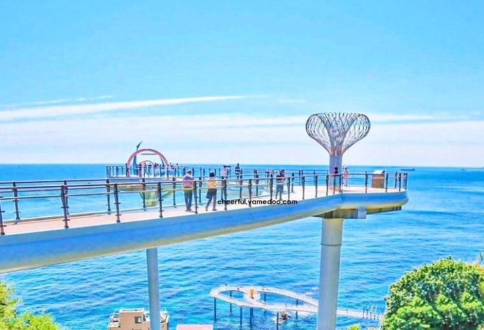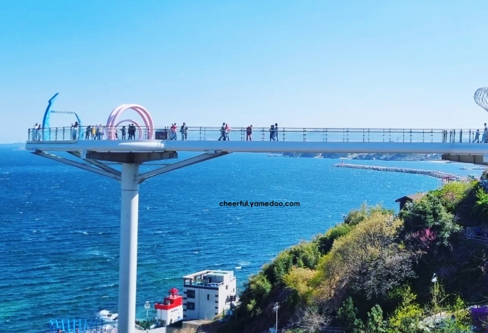 아래를 내려다보니 투명한 바닥 너머로 파도가 부서지는 모습이 선명하게 보여 짜릿한 기분이 들었습니다. 바람이 강하게 불어올 때마다 살짝 흔들리는 느낌이 스릴을 더해주었습니다. 전망대 끝에 서서 바라보는 바다는 끝없이 넓고, 멀리 수평선이 선명하게 이어져 있었습니다.