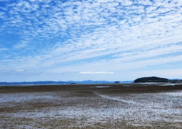 바닷물이 빠진 자리에는 작은 게와 조개들이 모습을 드러내며 갯벌 특유의 생동감을 느끼게 해주었습니다. 가까운 나무 데크길을 따라 걸으니 바다와 하늘이 맞닿은 풍경이 한층 더 시원하게 다가왔습니다.