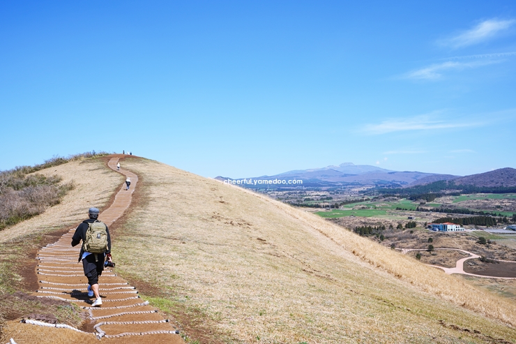 분화구 주변을 따라 걷는 길이 이어져 있어 조금 더 걸으며 다양한 각도에서 풍경을 감상할 수 있었습니다. 내려오는 길목에서는 노란 유채꽃이 군데군데 피어 있어 봄의 분위기가 가득 느껴졌습니다.