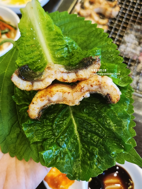 생강채와 깻잎 장아찌에 싸서 먹으니 장어 특유의 고소한 맛이 더욱 돋보였어요. 특히 장어의 탄력 있는 식감이 살아 있어 씹는 맛도 일품이었습니다.