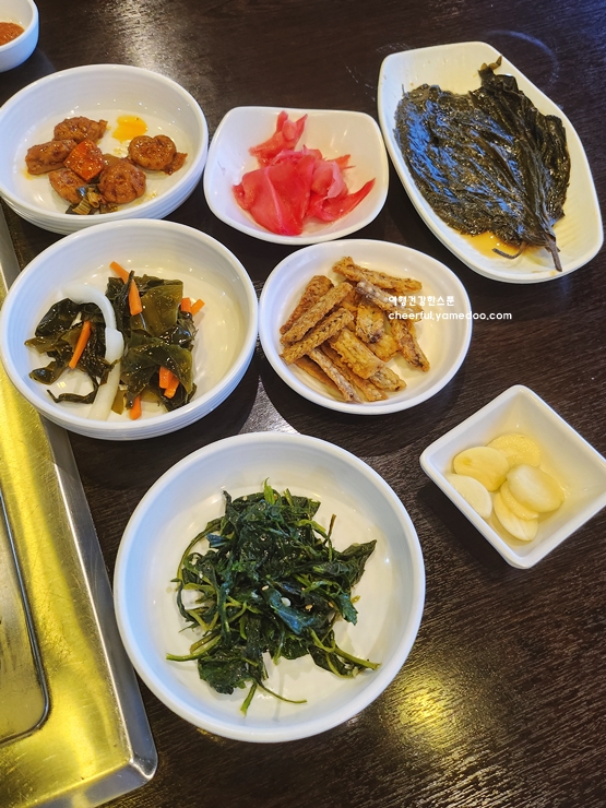 주문을 하고 나니 깔끔한 밑반찬들이 하나둘씩 차려지기 시작했습니다. 기본 반찬으로는 잡채, 나물, 감자채 볶음, 그리고 김치와 같은 친숙한 반찬들이 나왔습니다.