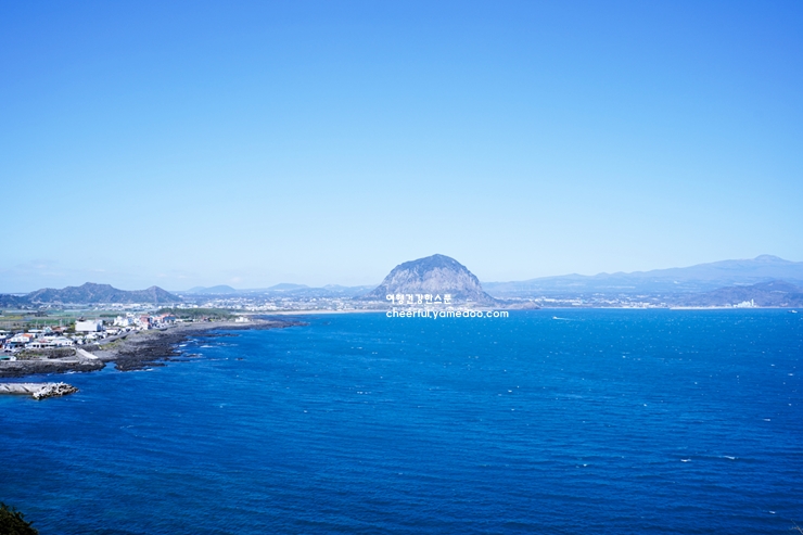 길을 따라 걷기 시작하자, 멀리 산방산이 보이기 시작했습니다. 유독 푸른 제주 바다와 어우러진 산방산은 한 폭의 그림 같았어요. 바다 건너 보이는 한라산 능선까지 선명하게 드러나면서, 제주도의 장대한 풍경이 펼쳐졌습니다.