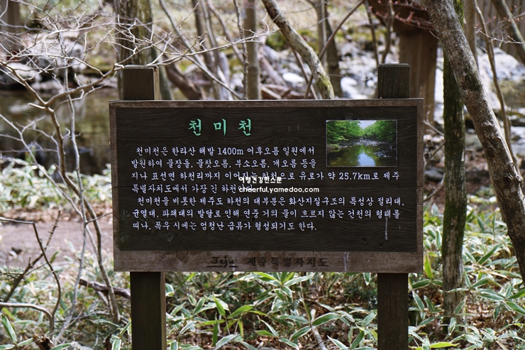 길을 따라 걷다 보니 '천미천'이라는 표지판이 보였습니다. 제주도의 천미천은 한라산에서 시작해 하천으로 이어지는 약 25.7km의 긴 물길입니다. 천미천을 따라 걷다 보면 계곡물이 졸졸 흐르는 소리가 들려와 마음까지 정화되는 느낌이었습니다.