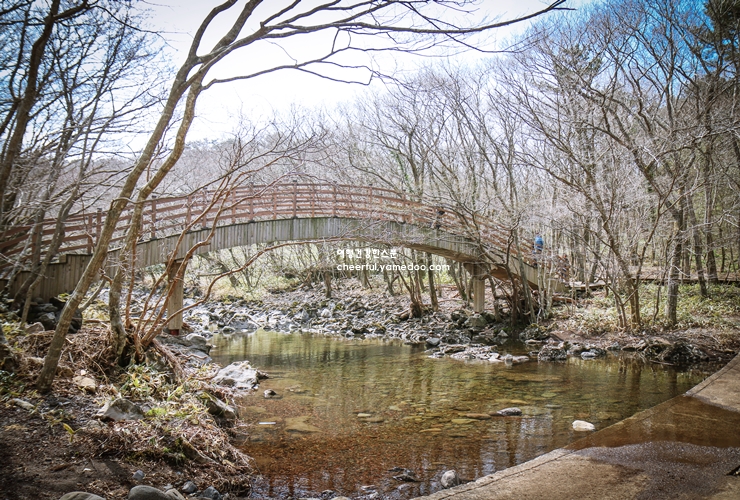 다시 길을 따라 걷다 보니 나무 사이로 작은 다리가 하나 보였습니다. 나무로 만든 다리는 천미천 위를 가로지르고 있었고, 다리를 건너면서 바라본 계곡은 참으로 평화로웠습니다.