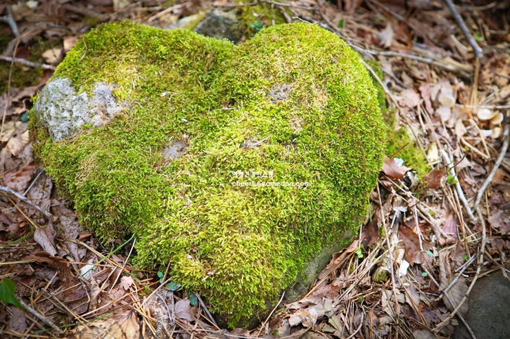 숲길을 걷다 보면 길가에 하트 모양으로 이끼가 덮인 바위가 보였는데, 자연이 만들어낸 이 작은 선물은 많은 이들의 발걸음을 멈추게 했습니다.